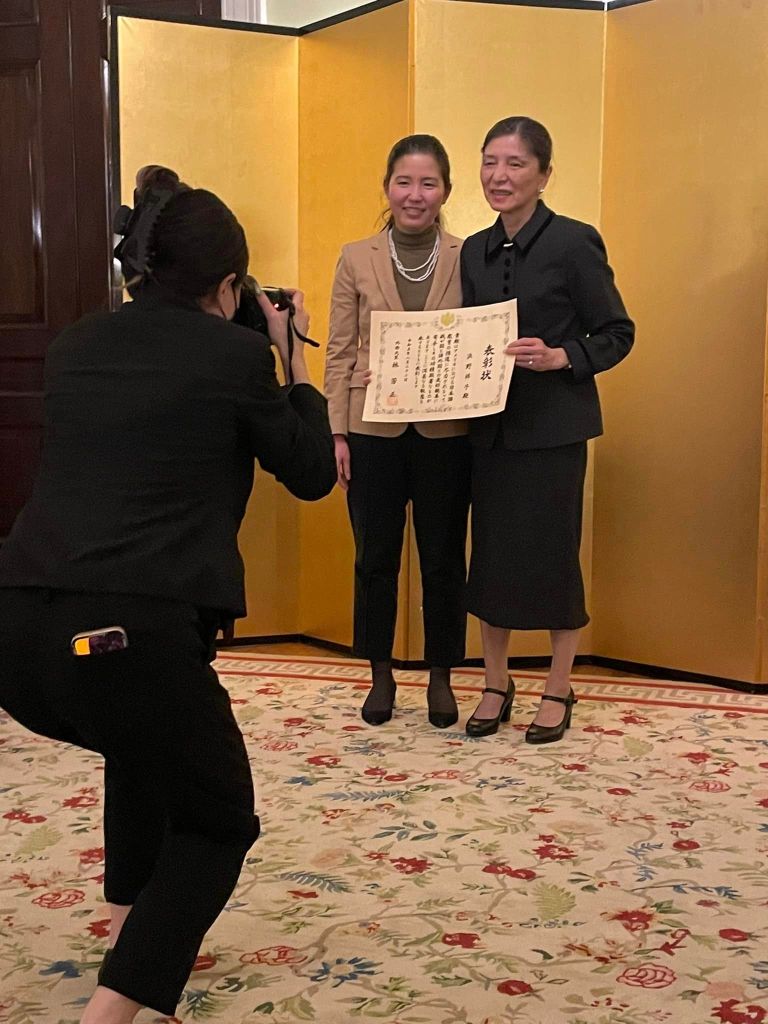 Last Tuesday, December 12, I had the privilege of being invited to the Embassy of Japan. I was very excited upon hearing about this opportunity to put myself out there. And I was beyond excited to find out that the event was to honor our level 1 Japanese teacher, Shoko Hamano-sensei, for her endeavors and dedication working to draw connections within the Japan-D.C. world. We had the pleasure of having Hamano-sensei teach us virtually from California last year. Although virtual, she had an impact on us as she was this cohort’s start into this program. We learned hiragana and our names in katakana from Hamano-sensei, so she’s a big deal to us. Starting Japanese 2, we’ve missed her and it saddened us that we wouldn’t be able to meet her in person. So, I also felt honored to be the first to see and personally greet her on behalf of my cohort.