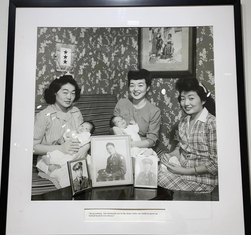 While walking around there were many photos that caught my attention. One that captured my attention the most was of three women sitting around a table smiling at the camera, two of whom held babies in their arms, and on the table were three pictures of their husbands in their military uniforms. At first, I thought that this meant their husbands had passed away until I read the caption. “Keep smiling. Our husbands are in the Army while our children grow up behind barbed wire fences.” This was in reference to the Japanese-Americans being in camps because President Franklin D. Roosevelt issued Executive Order 9066. E.O. 9066 meant Japanese-Americans were sent to camps behind barbed wire fences, weren’t able to leave, and had no role in deciding if they wanted to stay in their homes. The Army took volunteers to help fight in battle and their brave husbands stepped up to the plate along with many other Japanese-Americans, despite being held in imprisonment.