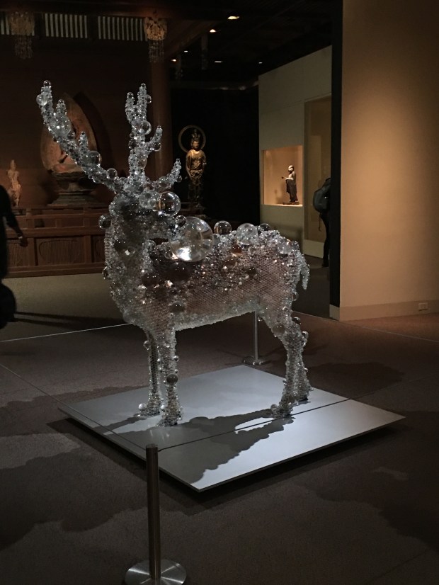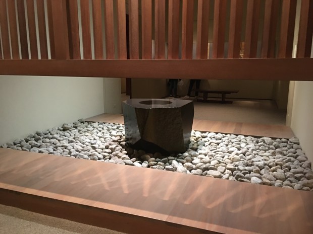 In many places there were very meticulously put together traditional rooms depicting historical architecture and interior design, or small enclaves displaying cooking pans and pots on tatami mats. My personal favorite however, was a large rock. To be more accurate, a fountain disguised as a large black stone. This is the Water Stone, created by Isamu Noguchi. Upon looking at the stone, I first thought it to only be rather shiny, but then I noticed the faint sound of water and realized that there was in fact, water flowing seamlessly over top the stone! It was very calming, and since the exhibit itself was quite silent, I simply sat there and enjoying sitting by it for a while.