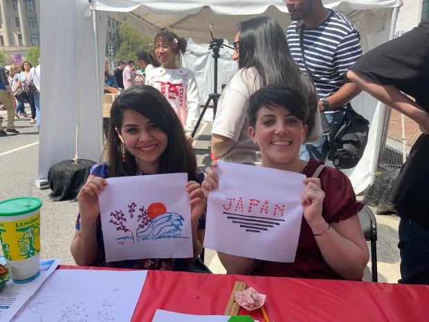 On April 13th, I had the pleasure of attending the Sakura Matsuri with the rest of my classmates. I was excited since I’d never been to the festival and had no idea what to expect. My shift began at noon, so I got to the booth around two minutes prior to that. Things were relatively easy once Sally explained what exactly was going on. I started off by running the “Learn to write your name in Katakana” part of the booth. It was simple and fun, but I occasionally had to check with Eshita sensei when I was unsure about whether or not a name had a long vowel.